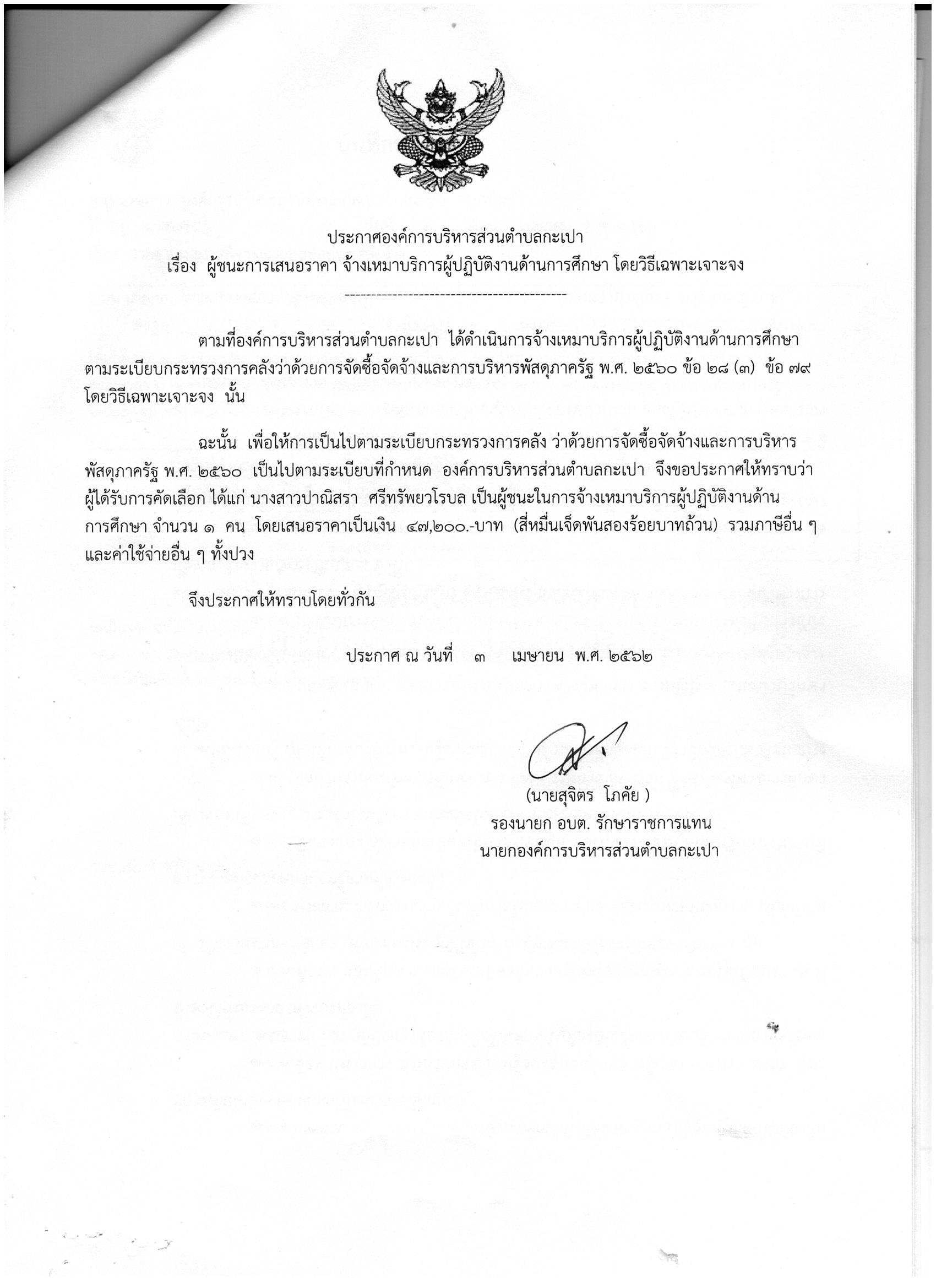 ประกาศ ผู้ชนะการเสนอราคา จ้างเหมาบริการผู้ปฏิบัติงานด้านการศึกษา โดยวิธีเฉพาะเจาะจง