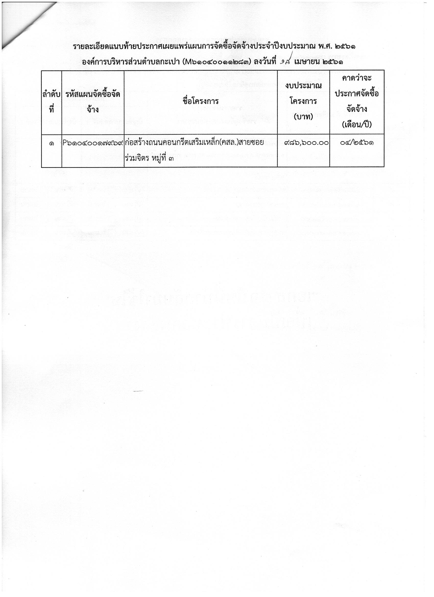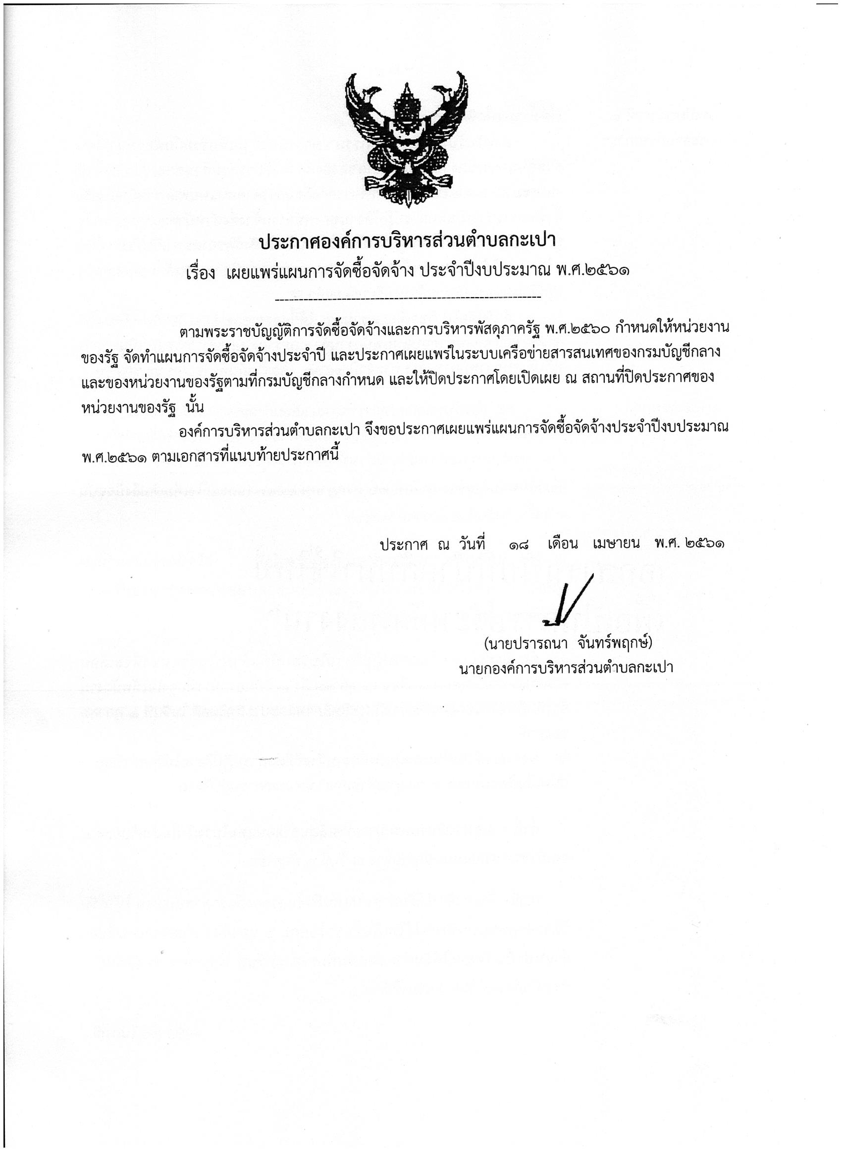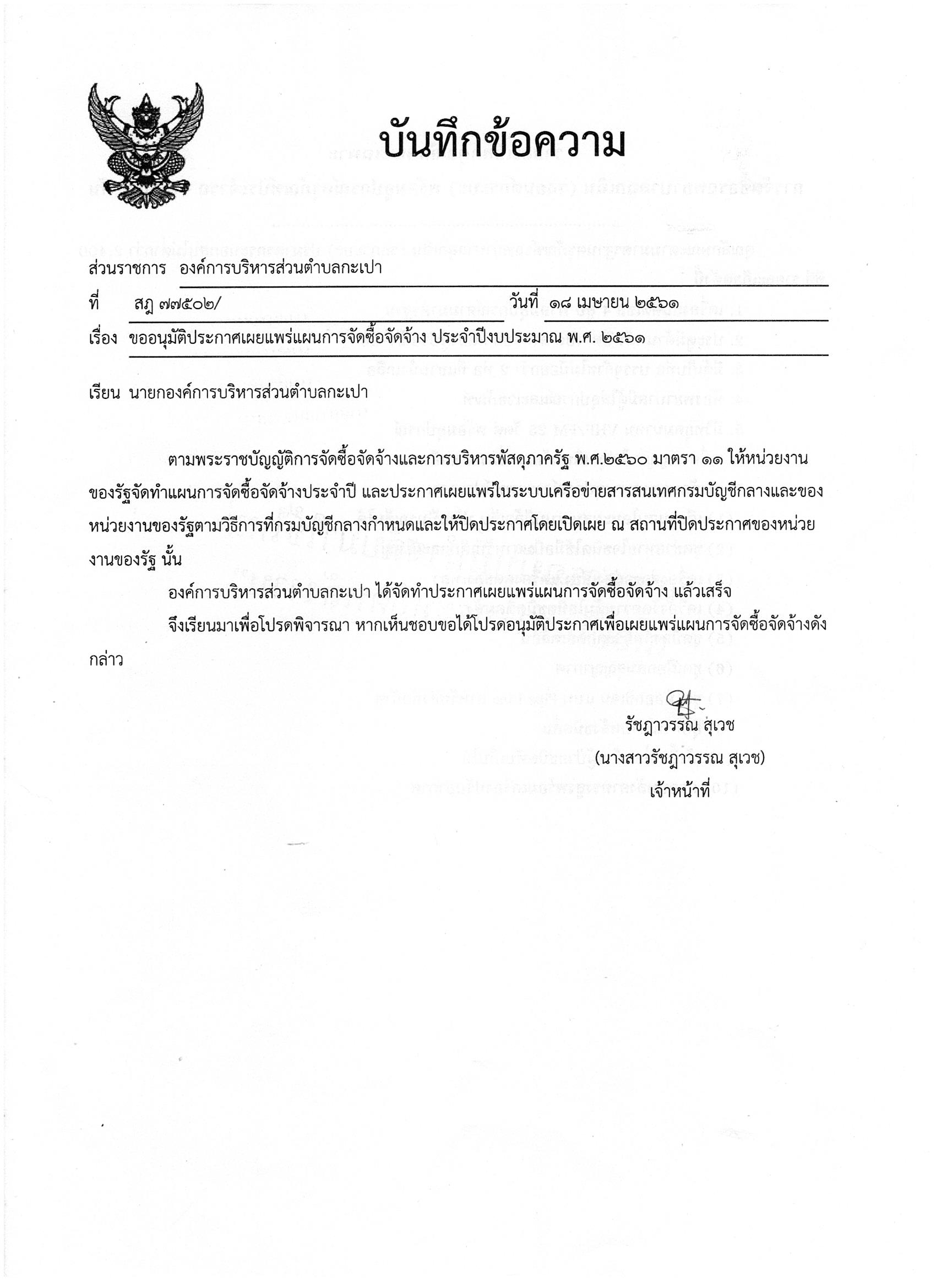 ขออนุมัติประกาศเผยแพร่แผนการจัดซื้อจัดจ้าง ประจำปีงบประมาณ พ.ศ. ๒๕๖๑