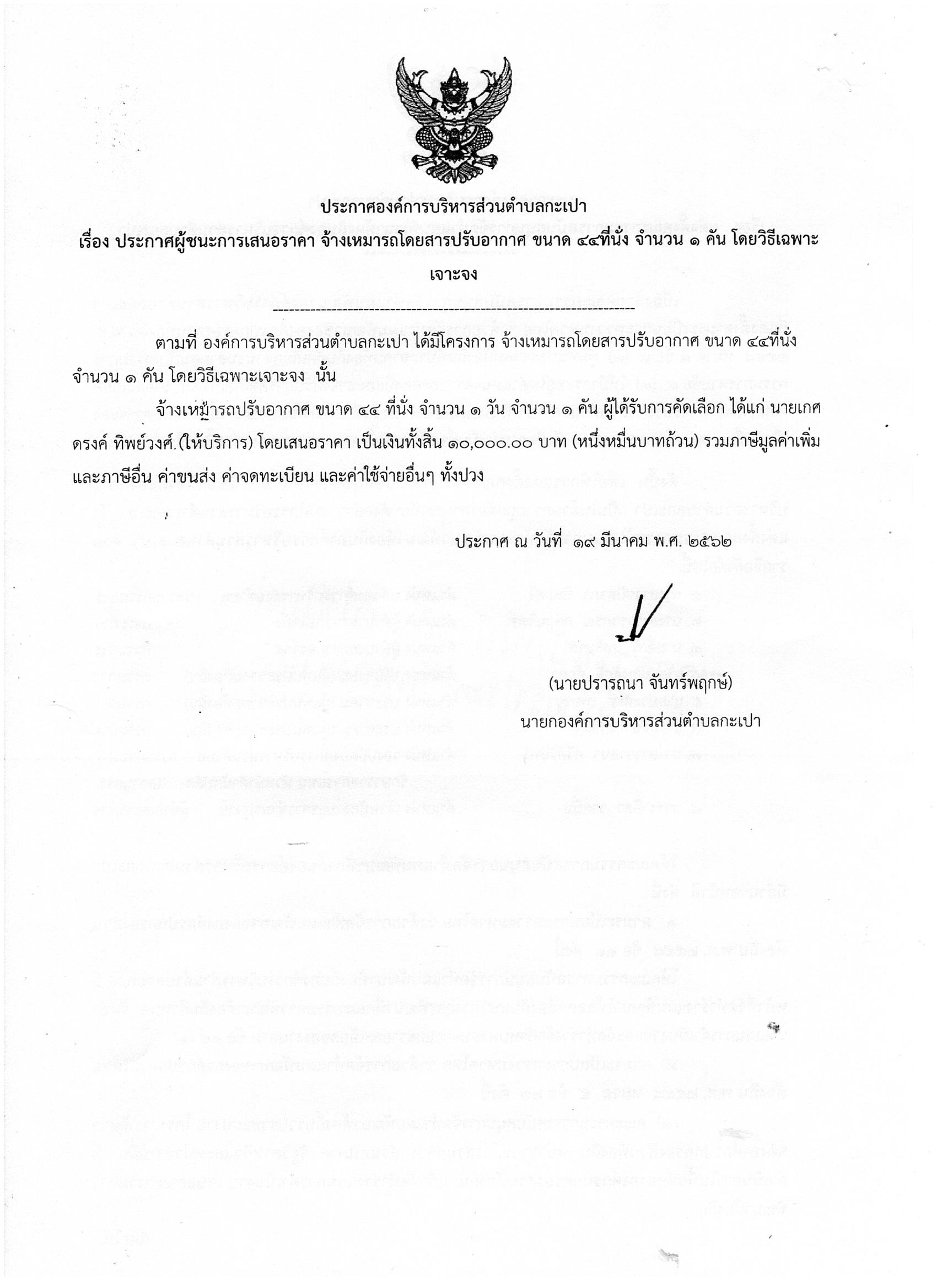 ประกาศผุ้ชนะการเสนอราคา จ้างเหมารถโดยสารปรับอากาศ ขนาด 44 ที่นั่ง จำนวน 1 คัน โดยวิธีเฉพาะเจาะจง