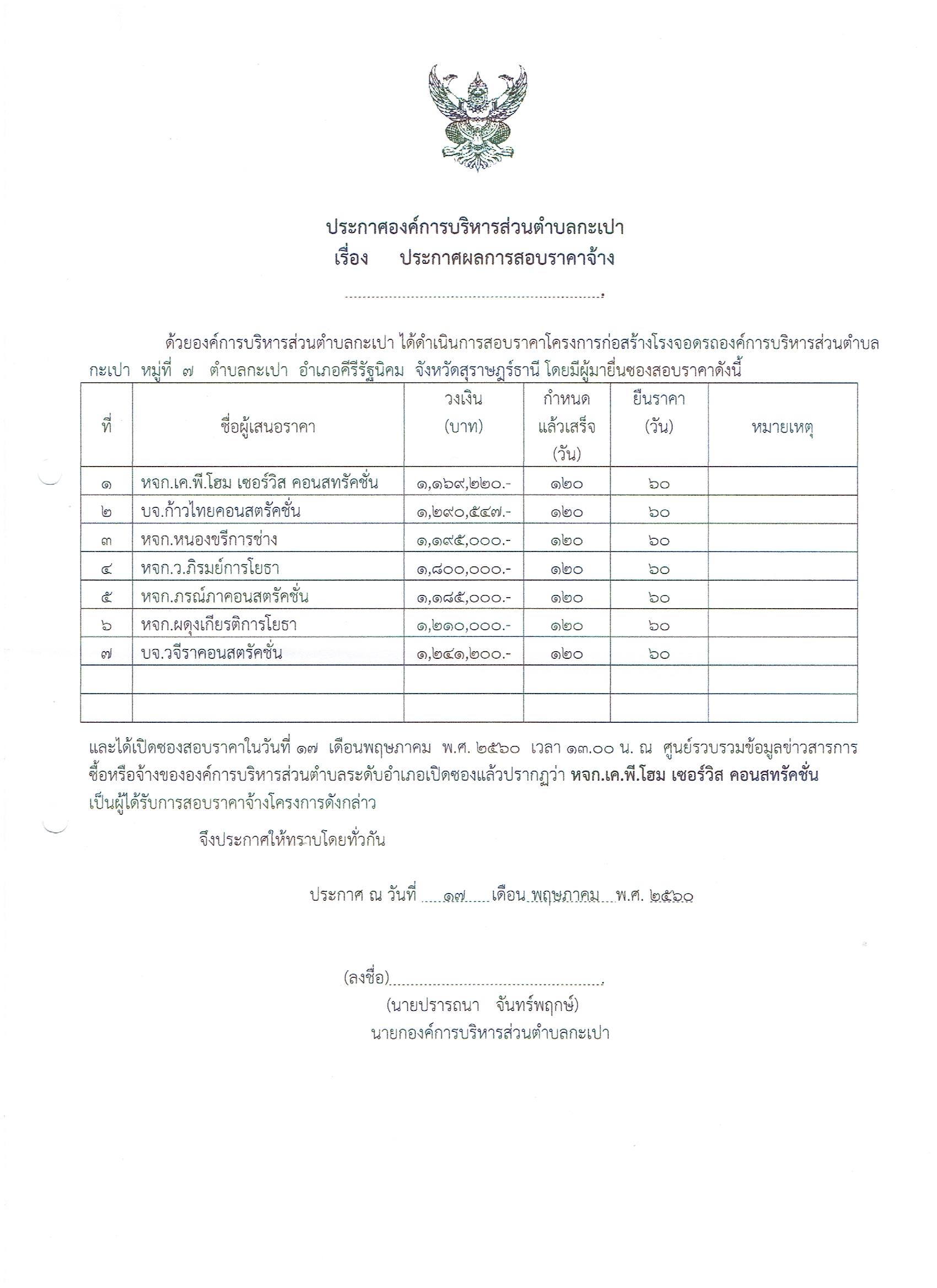 ประกาศผลการสอบราคาจ้างโครงการก่อสร้างโรงจอดรถ อบต.กะเปา