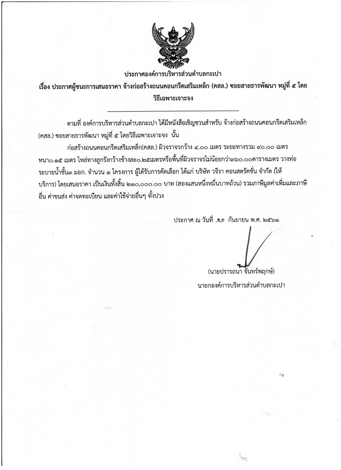 ประกาศผู้ชนะการเสนอราคา จ้างก่อสร้างถนนคอนกรีตเสริมเหล็ก (คสล.) ซอยสายพัฒนา หมู่ที่๕ โดยวิธีเฉพาะเจาะจง