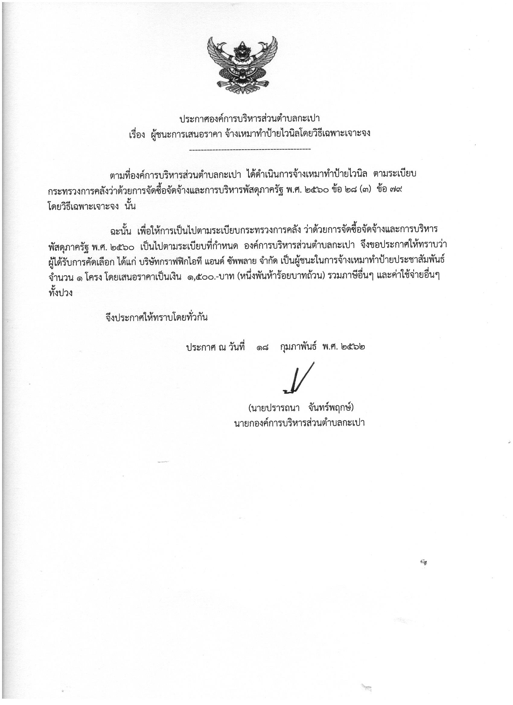 ผู้ชนะการเสนอราคา จ้างเหมาทำป้ายไวนิลโดยวิธีเฉพาะเจาะจง