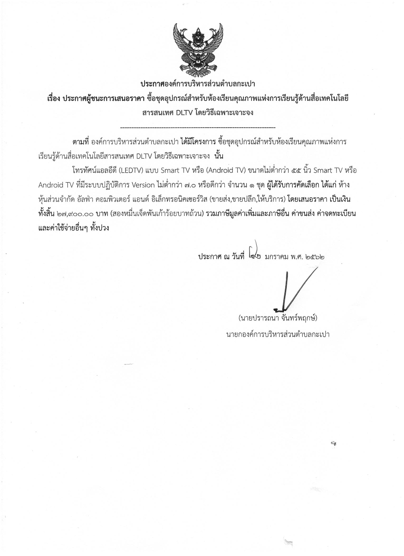 ประกาศผู้ชนะการเสนอราคา ซื้อชุดวัสดุอุปกรณ์สำหรับห้องเรียนคุณภาพแห่งการเรียนรู้ด้านสื่อเทคโนโลยี่ สารสนเทศ DLTV โดยวิธีเฉพาะเจาะจง