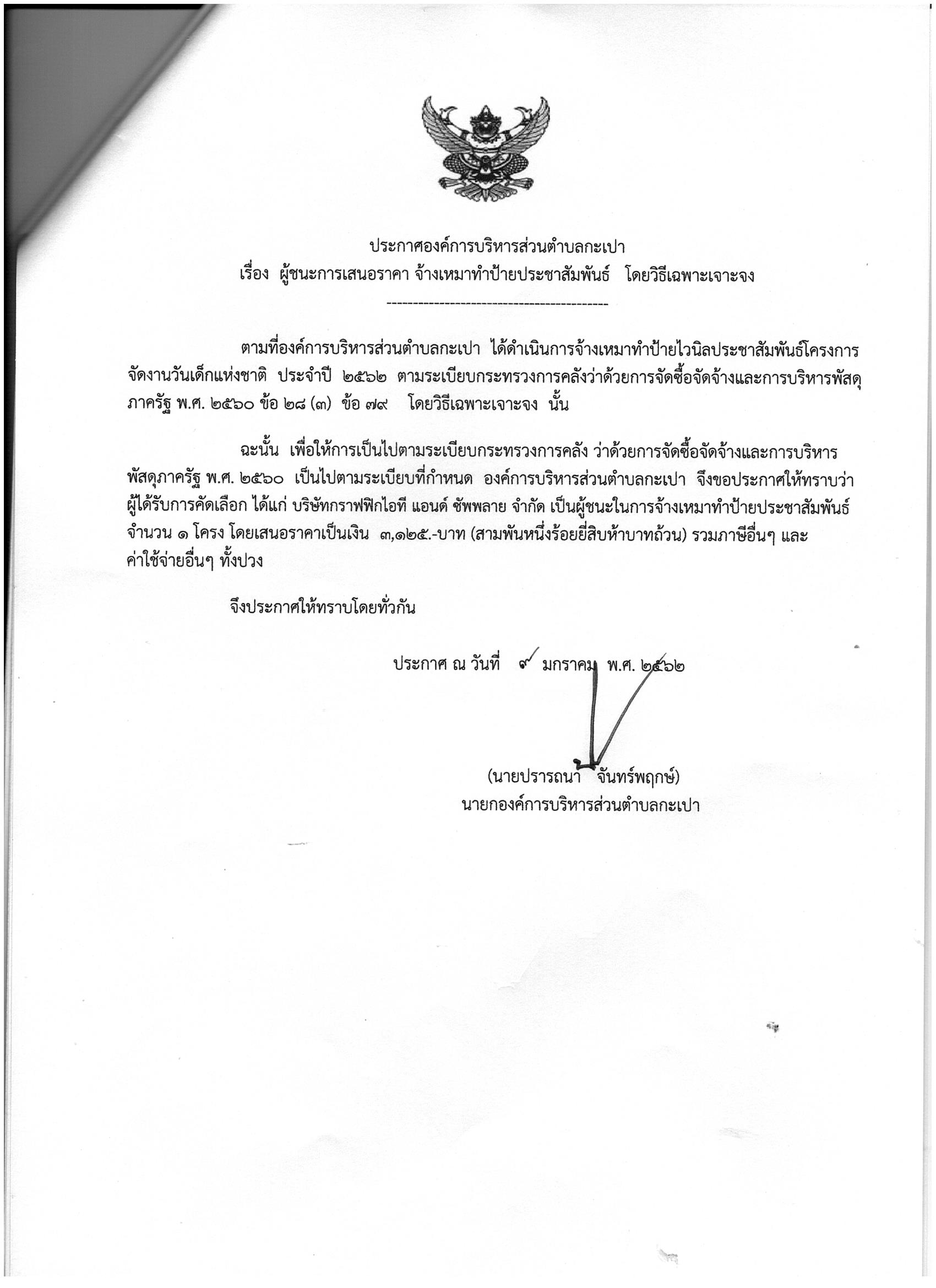 ประกาศผู้ชนะการเสนอราคา จ้างเหมาทำป้ายประชาสัมพันธ์ โดยวิธีเฉพาะเจาจง