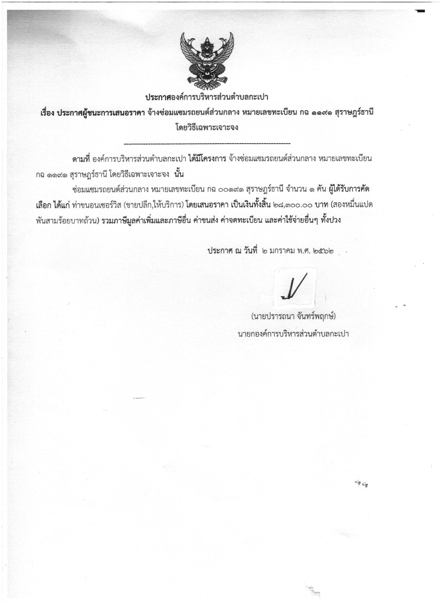 ประกาศผู้ชนะการเสนอราคา จ้างซ่อมแซมรถยนต์ส่วนกลาง หมายเลขทะเบียน กฉ1191 สุราษฏร์ธานี