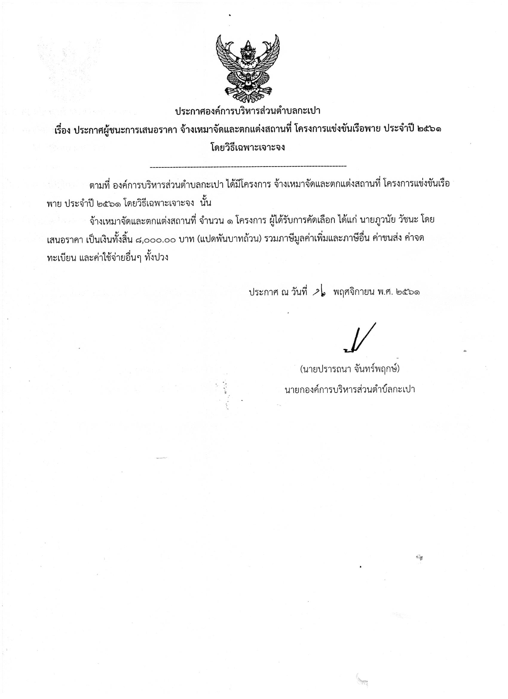 ประกาศผู้ชนะการเสนอราคา จ้างเหมาจัดเเละตกเเต่งสถานที่ โครงการเเข่งขันเรือพาย ประจำปี 2561 โดยวิธีเฉพาะเจาะจง