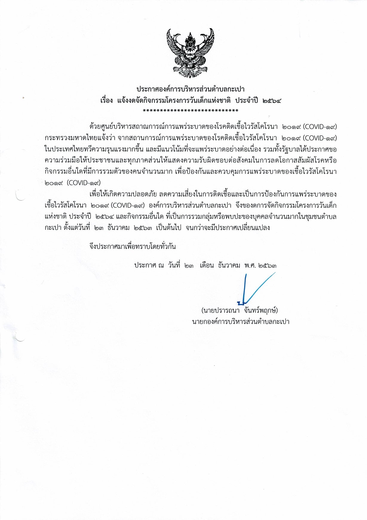 ชื่อเรื่อง : ประกาศองค์การบริหารส่วนตำบลกะเปา เรื่อง..แจ้งงดการจัดกิจกรรมโครงการวันเด็กแห่งชาติ