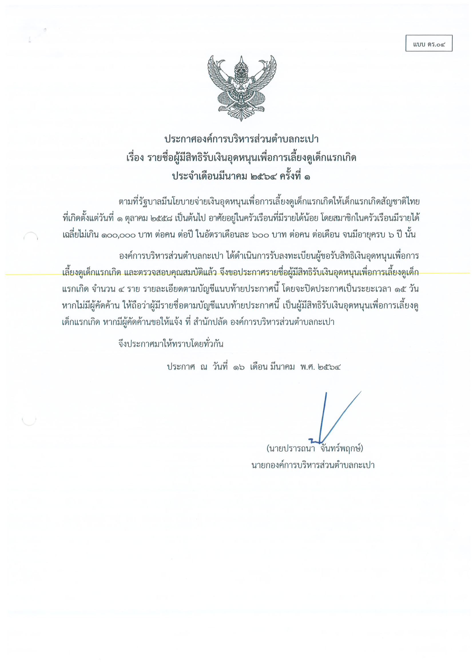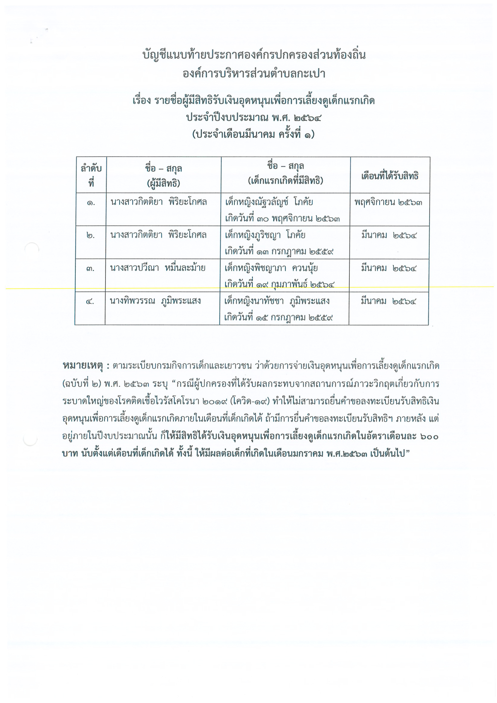 ประกาศรายชื่อผู้มีสิทธิรับเบี้ยรับเงินอุดหนุนเด็กแรกเกิด ประจำเดือน มีนาคม 2564 ครั้งที่ 1
