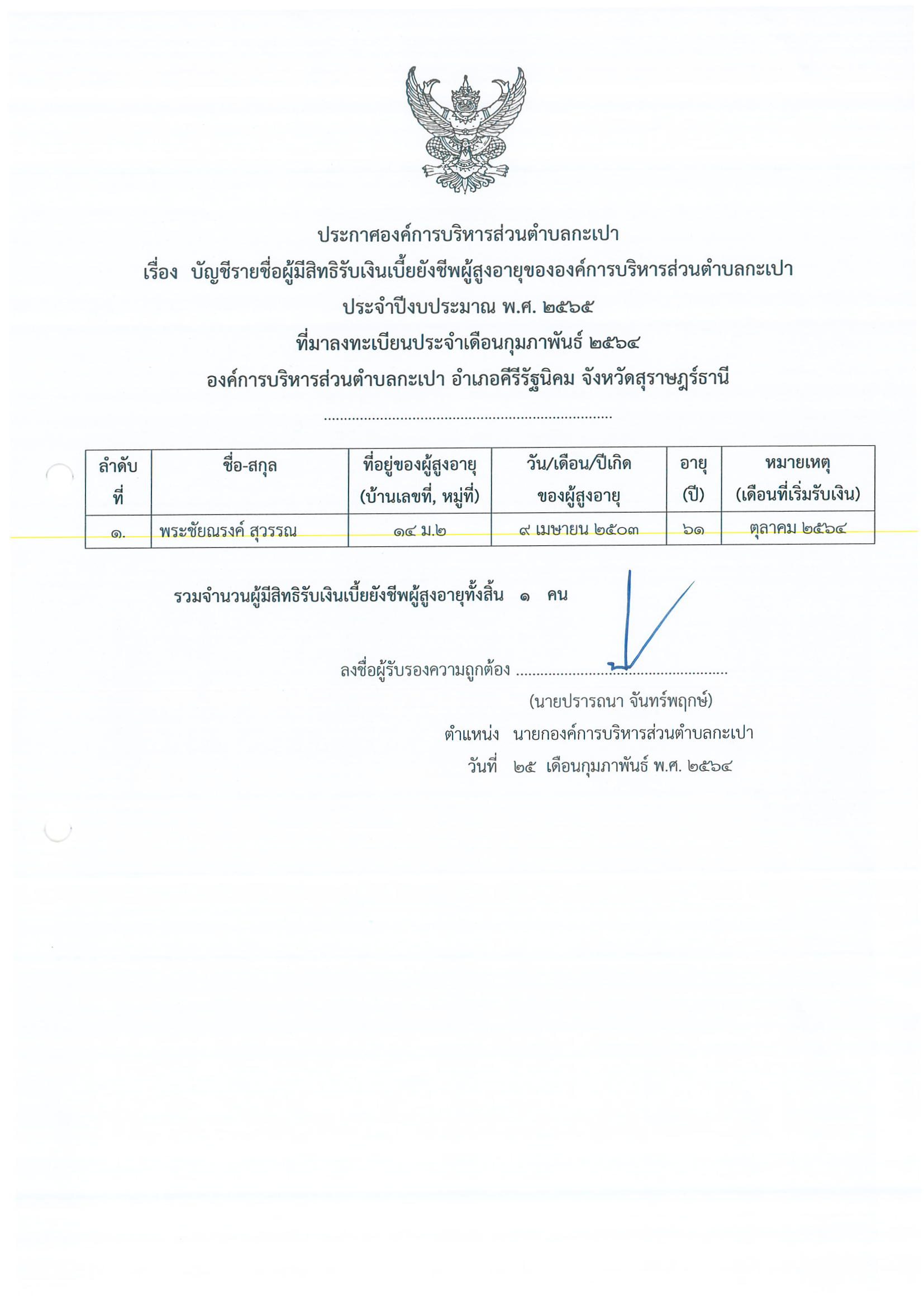 ประกาศรายชื่อผู้มีสิทธิรับเบี้ยยังชีพผู้สูงอายุประจำปี 2565 ที่มาลงทะเบียนประจำเดือน กุมภาพันธ์ 2564