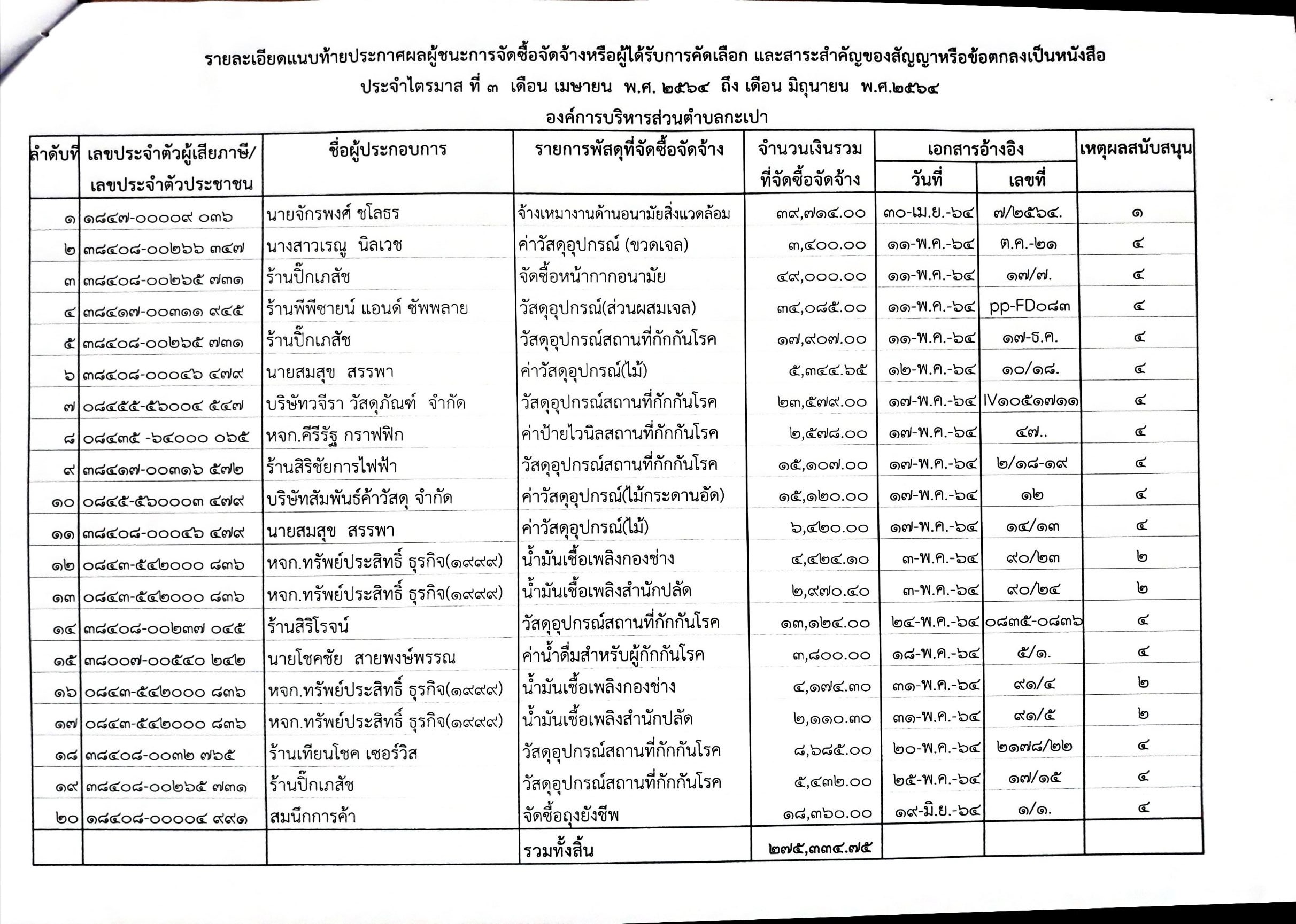 ประกาศผลผู้ชนะการจัดซื้อจัดจ้างหรือผู้ได้รับการคัดเลือกและสาระสำคัญของสัญญาหรือข้อตกลงเป็นหนังสือประจำไตรมาสที่ ๓