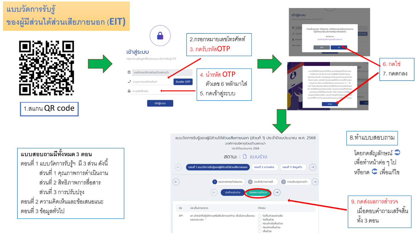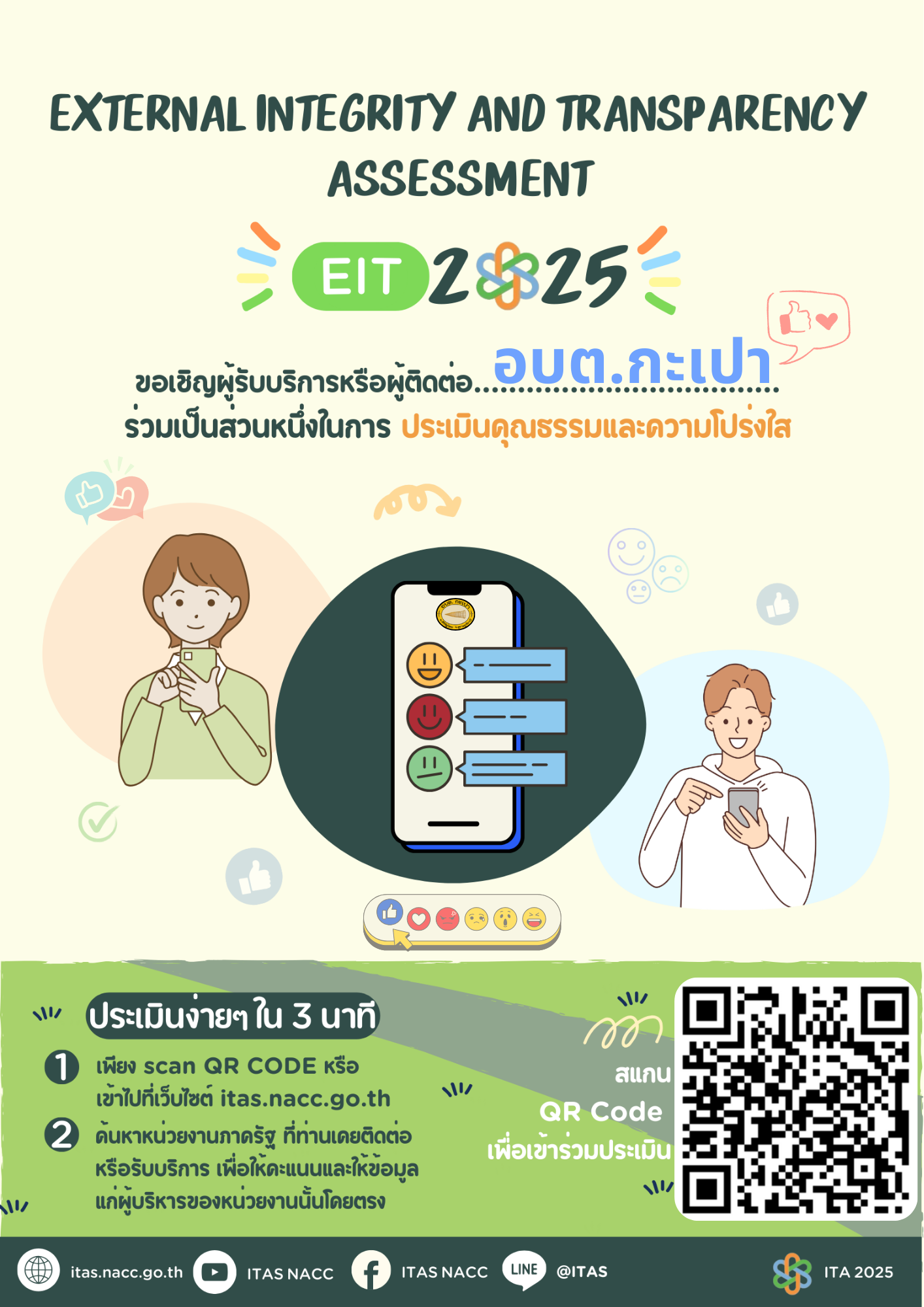 รายละเอียด : ขอเชิญผู้รับบริการหรือผู้ติดซึ่งเป็นผู้มีส่วนได้ส่วนเสียภายนอก (EIT) ร่วมทำแบบสอบถามประเมินคุณธรรมและความโปร่งใสในการดำเนินการของหน่วยงานภาครัฐ (ITA) ขององค์การบริหารส่วนตำบลกะเปา ประจำปีงบประมาณ พ.ศ.2568
