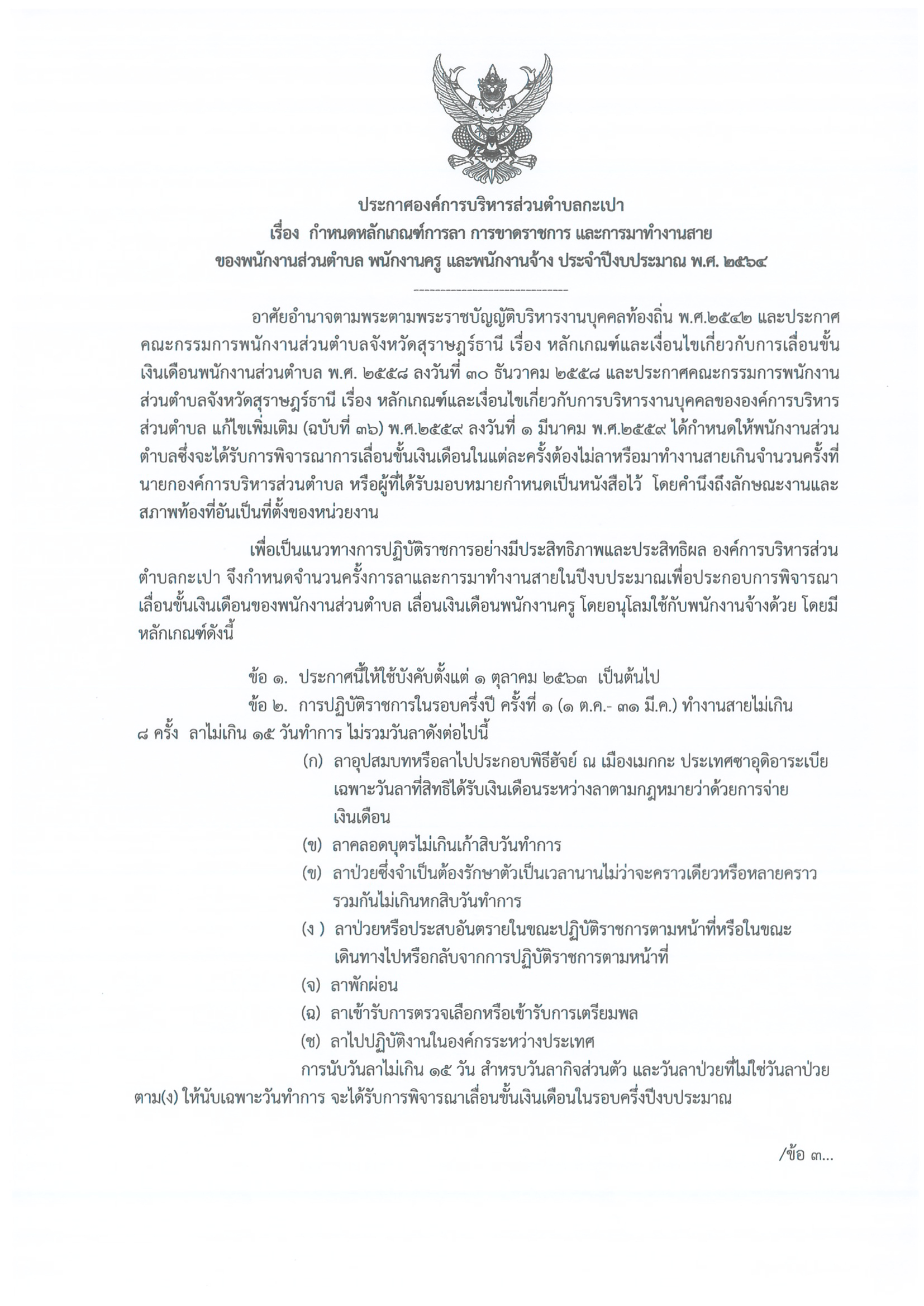 ประกาศกำหนดหลักเกณฑ์ การลา การขาดราชการและการมาทำงานสายของพนักงานส่วนตำบลประจำปีงบประมาณ 2564